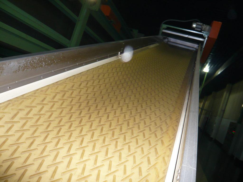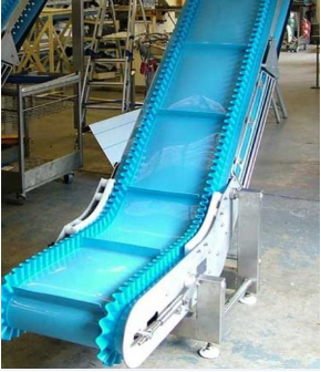 PU白色食品輸送帶(裙邊擋板帶),擋邊起防止物料測滑撒落的作用。為便于轉彎,裙邊設計成波紋狀;橫隔板的作用是承托物料,為了實現(xiàn)大傾角輸送,采用T型TC型。檔邊和橫隔板是用二次硫化的方法與基帶連接的,具有很高的連接強度。用于輸送易散落的粉狀、粒狀、小塊狀、糊狀及液態(tài)狀物料。
