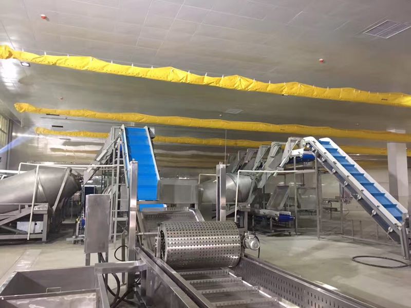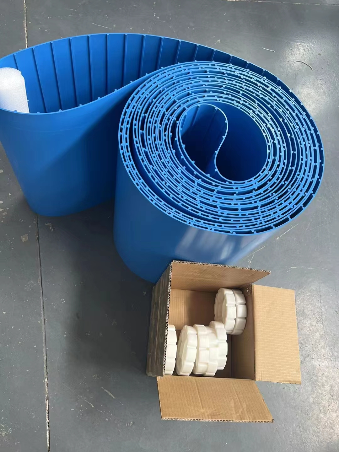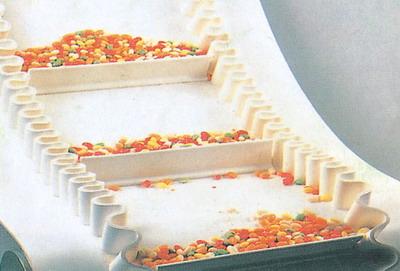 白色食品輸送帶(裙邊擋板帶),擋邊起防止物料測滑撒落的作用。為便于轉(zhuǎn)彎,裙邊設(shè)計成波紋狀;橫隔板的作用是承托物料,為了實(shí)現(xiàn)大傾角輸送,采用T型TC型。檔邊和橫隔板是用二次硫化的方法與基帶連接的,具有很高的連接強(qiáng)度。用于輸送易散落的粉狀、粒狀、小塊狀、糊狀及液態(tài)狀物料。